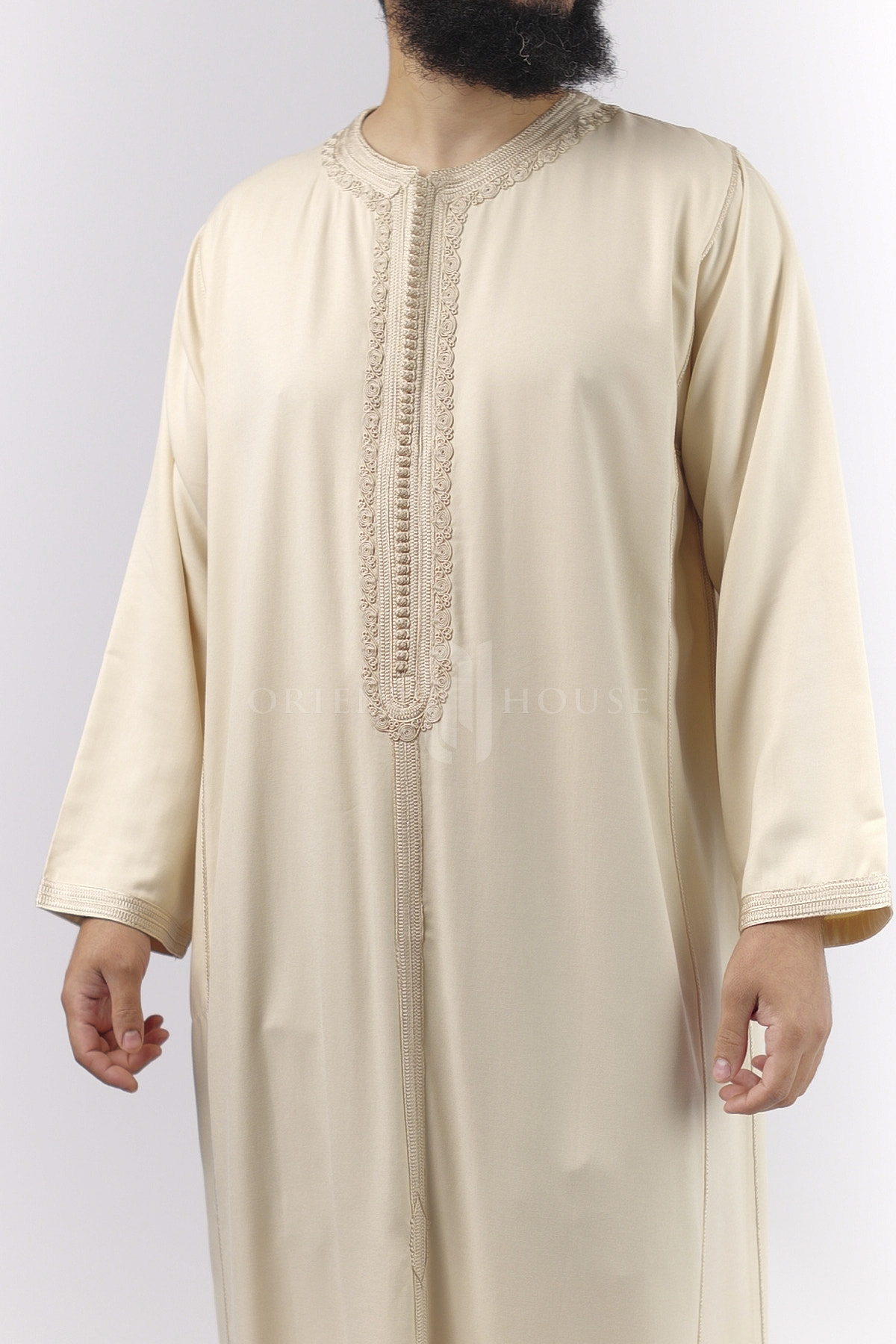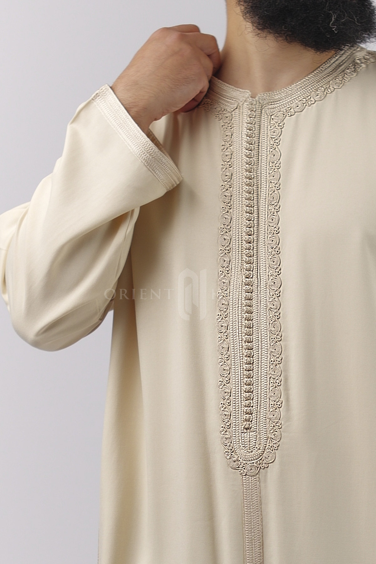 La pièce se distingue par sa magnifique broderie travaillée sur le torse, mettant en valeur un savoir-faire inspiré des traditions orientales.