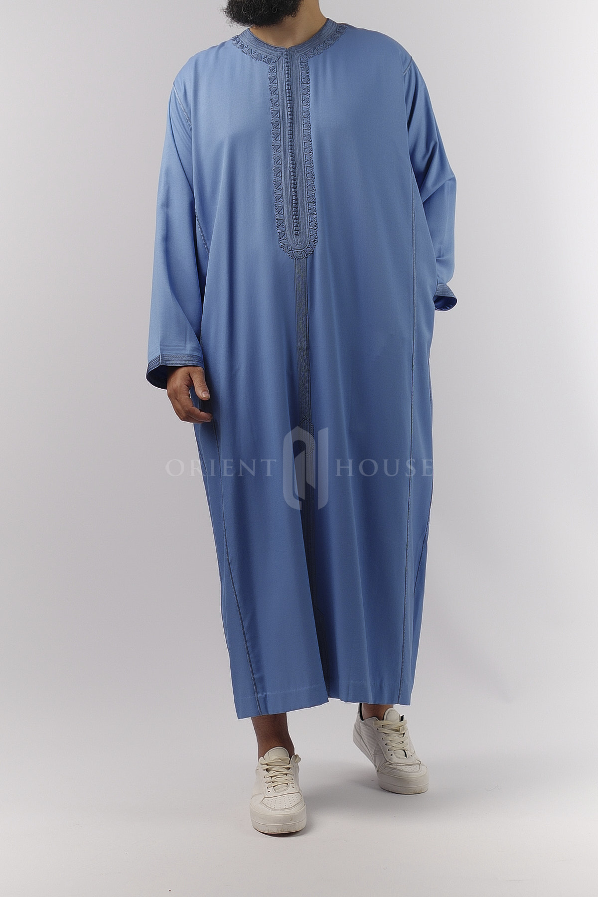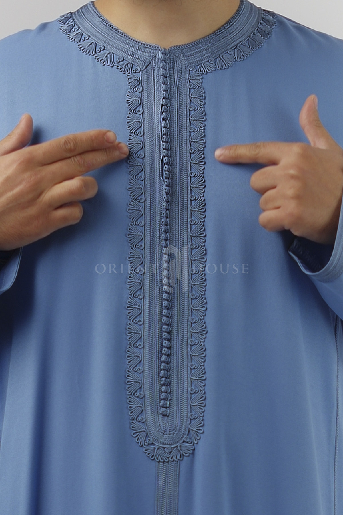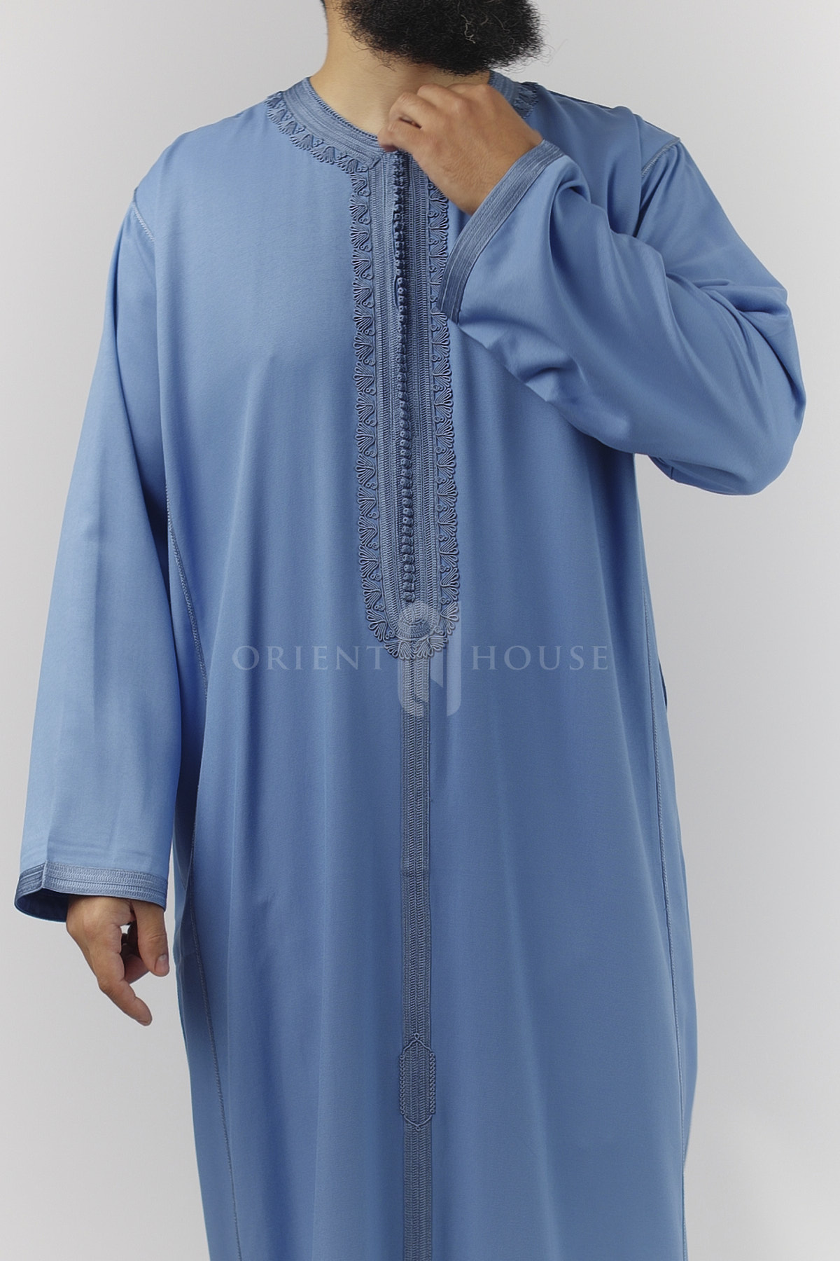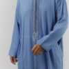 Un zip invisible au niveau de la poitrine permet d’enfiler le caftan facilement, tout en conservant une finition nette et épurée.