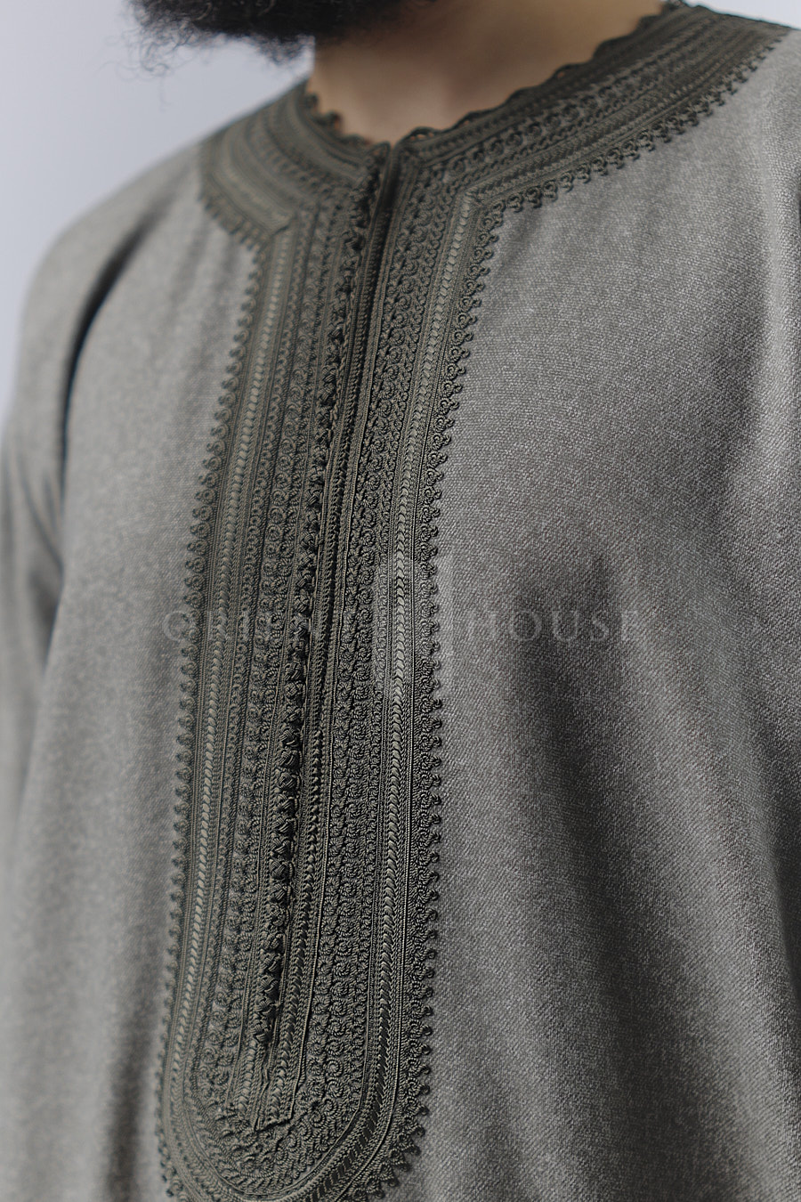 Le Caftan Siraj se distingue par sa magnifique broderie travaillée sur le torse et faisant le tour complet du cou.