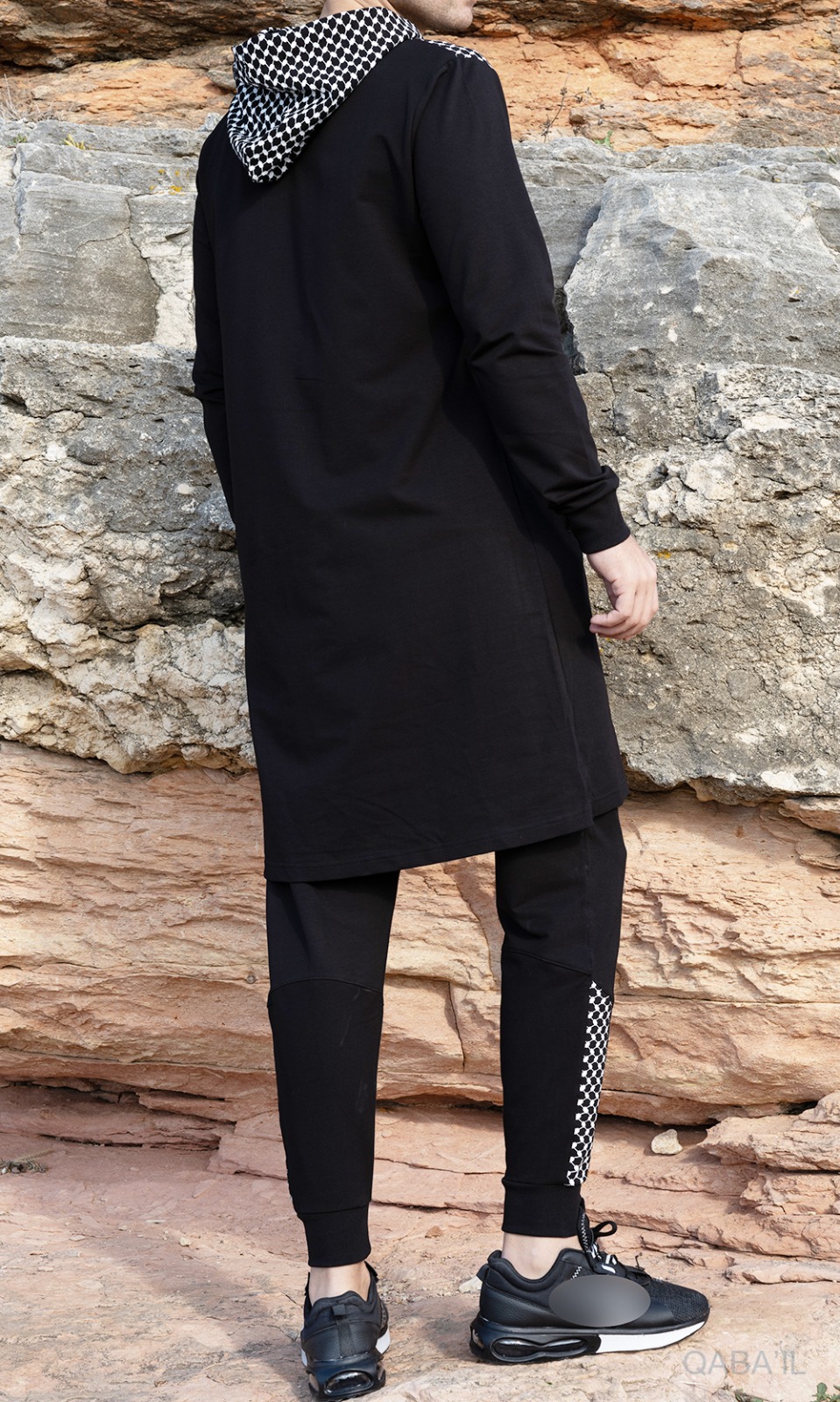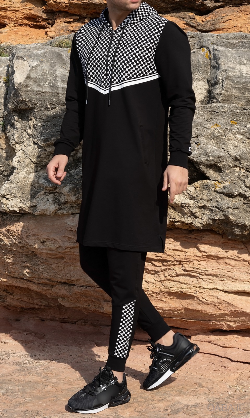 Son design raffiné se distingue par un motif exclusif, rappelant le célèbre keffieh palestinien, délicatement intégré au niveau du torse et subtilement répété sur les chevilles. Ce détail apporte une touche symbolique et esthétique, faisant de cet ensemble bien plus qu’un simple vêtement : un hommage à une culture riche et intemporelle.