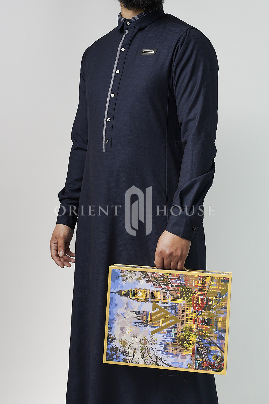 Ce Qamis est livré dans une boîte coffre au design inspiré des grandes maisons de luxe, renforçant son positionnement exclusif.