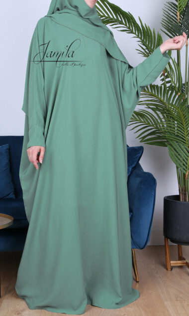 Robe Abaya manches bouffantes avec élastique aux poignées de couleur Grise teintée de bleu.